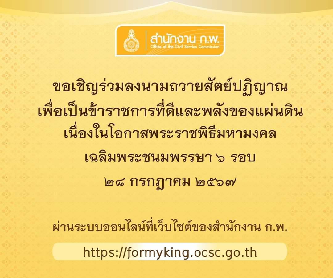 ร่วมลงนามถวายสัตย์ปฏิญาณเพื่อเป็นข้าราชการที่ดีและพลังของแผ่นดิน ได้ที่ https://formyking.ocsc.go.th